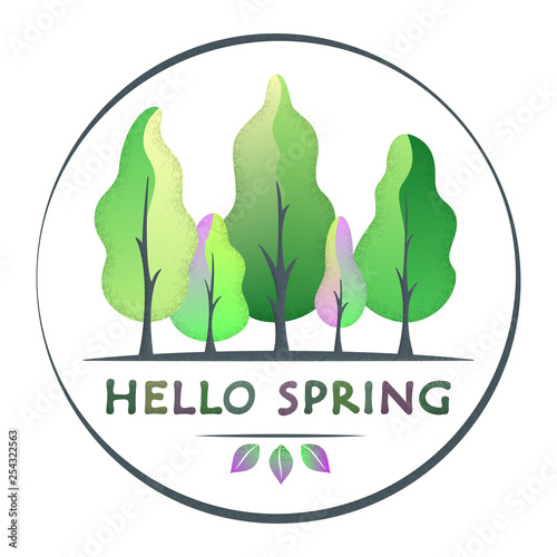 Hello spring - creative concept with spring tone forest in circle. Semi flat design. For greeting card, poster and celebration banner, icon, logo, print, cards, and labels. Vector illustration