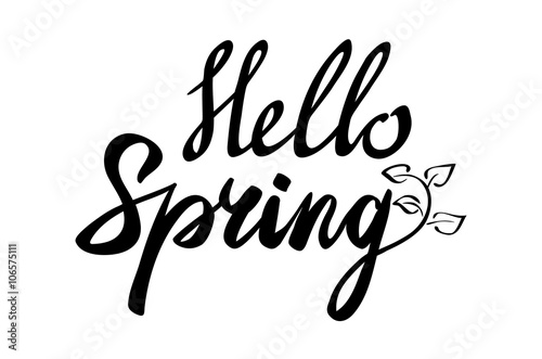 Hello spring inscription. Greeting card with calligraphy. Hand drawn lettering design. Usable as photo overlay. Typography for banner, poster or apparel design. Isolated vector element.
