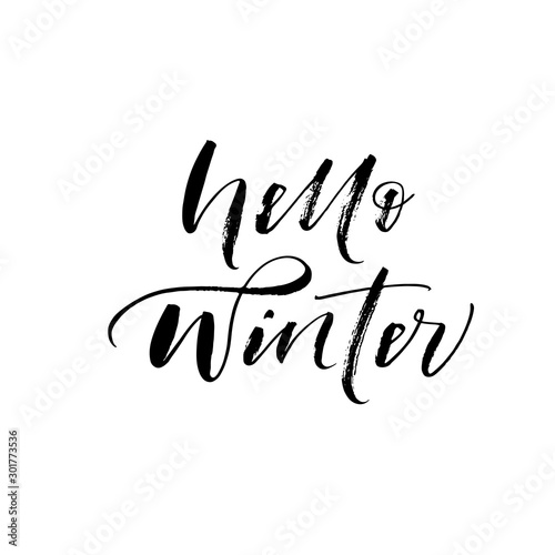 Hello winter calligraphy phrase. Hand drawn ink illustration isolated on white.