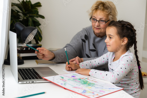 Helpful granny. Helpful loving granny assisting her cute granddaughter making homework