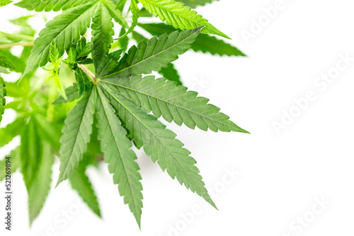 Hemp Cannabis indica leaf isolated on white background banner with space for text