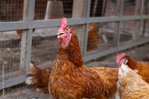 red, brown, spring, avian, summer, eye, comb, head, fence, wing, countryside, grass, egg, group, garden, cock, eating, meat, fowl, food, poultry, farming, agriculture, chicken, animal, eat, chick, farm, farm animal, bird, hen, country, nature, natural, green, organic, live, domestic, range, bio, rural, rooster, breeding, cockerel, beak, feather