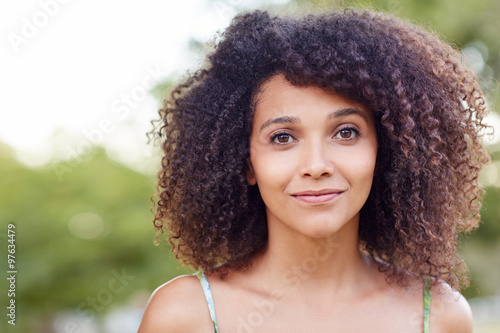 woman, real, nature, mixed race, ethnic, curly hair, contemporary, carefree, 20s, adult, afro, alone, attractive, beautiful, brunette, casual attire, closeup, copy space, cropped, curl, cute, dark hair, expression, face, fashionable, female, girl, coiffure, happy, natural, 1, outdoors, park, portrait, positivity, relaxed, relaxing, rural, smiling, standing, summer, sunny, trendy, young, youth, youthful