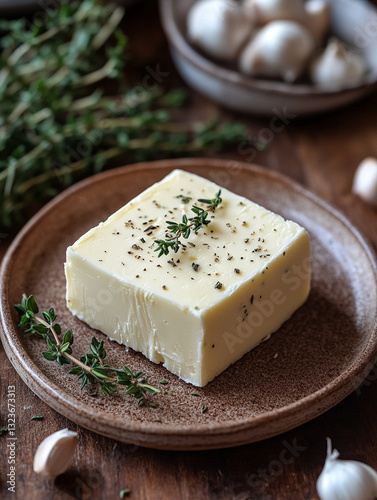 butter, herb, thyme, garlic, cooking, food, kitchen, rustic, culinary, epicure, seasoning, fresh, natural, ingredient, organic, flavorful, receipe, dairy, cookery, garnish, preparation, dining, plate, dish, block, green, wooden, table, meal, wholesome, aromatic, vegetarian, tableware, culinary arts, favor, savoury, homemade, feast