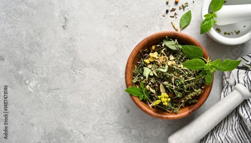 Herb preparation in a rustic kitchen setting natural ingredients culinary arts cozy environment top view healthy cooking
