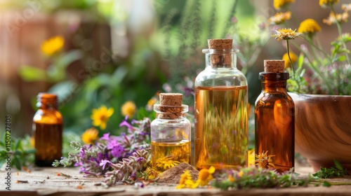 Herbal essential oils in glass bottles outdoors
