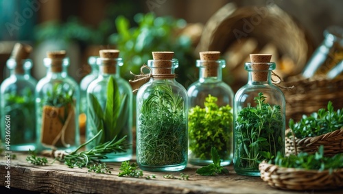 Herbal medicine in bottles of thyme and rosemary essential oil or infusion.