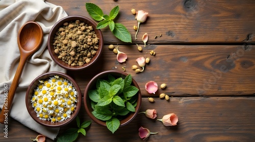 tea, herbal, natural, chamomile, mint, rose, flower petals, bowl, wood, spoon, rustic, wellness, lifestyle, ingredient, beverage, organic, dried, flower, cosy, health, leaf, ritual, setup, arrangement, table, brown, green, clean, soft, topview, aesthetic, minimal, tea leaf, warm, nature, vintage, eco, drink, fresh, linen, tray, spoonful, detox, earthy