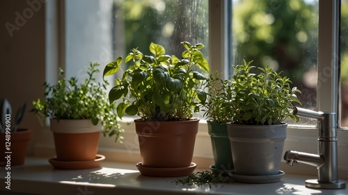 Herbs in pots adorn a windowsill, bathed in sunlight creating a calming atmosphere. A touch of nature indoors.
