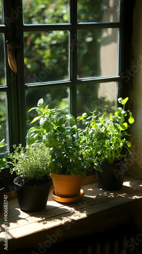herb, potted plants, basil, thyme, window sill, window, plant, greenery, gardening, herb, organic, fresh, healthy, home, indoor, sunlight, light, natural light, still life, rustic, vintage, wooden, window sill, nature, green, leaf, food, cooking, aromatic, garden, homegrown, cosy, interior, lifestyle, closeup, detail, growing, agriculture, summer, spring, country, farmhouse, simple, freshness, nourishment, healthy eating