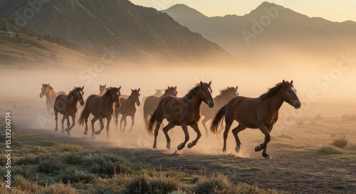 horse, horse, herd, run, landscape, dust, haze, brown, gold, light, movement, freedom, open, huge, wide, nature, wild, animal, migration, journey, background, texture, calm, serene, majestic, illustration, design, image