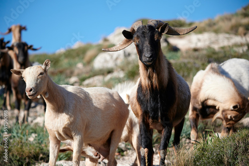 herd, mountain, goat, graze, grassy, hill, field, animal, herbivore, domestic, nature, mammal, meadow, natural, rock, farm animal, rocky, stone, pasture, highland, daylight, rural, fauna, wildlife, environment, grass, habitat, peaceful, wild, countryside, daytime, zoology, horn, breed, national, outdoors, outside, blue skies