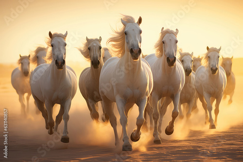 Herd Of White Horses Running Across The Beige Sand At Golden Hour. Generative AI