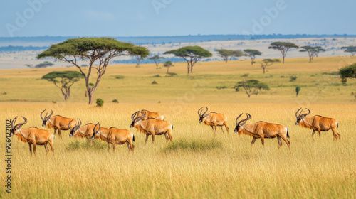 Herds of eland, the largest African antelope, roam the expansive plains of Kenya, grazing peacefully on grasses and leaves. --ar 16:9 --v 6.1 Job ID: 17acb2ff-a5c2-4d51-ad53-40a405329fc9