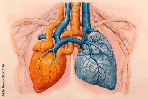 nubes, lung, artery, vein, anatomy, medicals, illustration, drawing, artwork, colourful, orange, blue, vascular, system, respiratory, circulatory, human, body, organ, detail, realistic, intricate, vignetting, coloured, watercolor, art, science, biology, health care