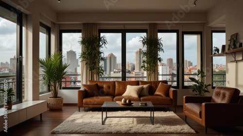 apartment, city, contemporary, couch, design, home, house, interior, leather, living, modern, room, sofa, style, urban, view, window, plant, decor, furniture, luxury, roomy, light, comfortable, elegant, stylish, cosy, aesthetic, architecture, ambience, dwelling, habitat, residence, setting, space, sunlit, wooden, floor, carpet, cushion, table, shelf, potted, greenery, panoramic, skyline, daylight, highrise
