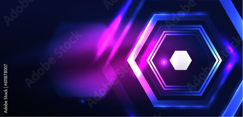 Hexagon abstract background. Techno glowing neon hexagon shapes vector illustration for wallpaper, banner, background, landing page, wall art, invitation, prints, posters