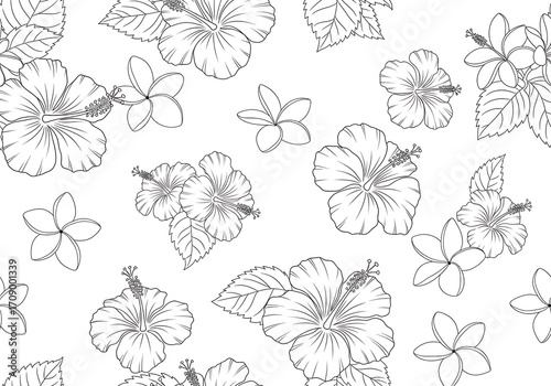 Hibiscus and plumeria flower seamless line art pattern illustration