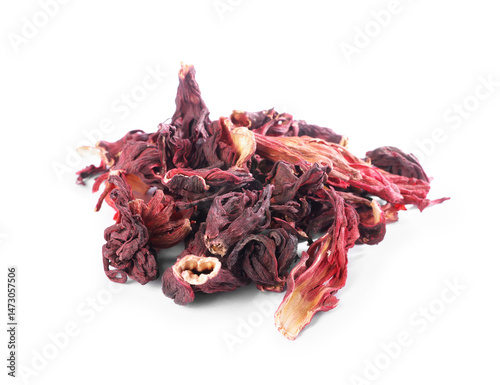 Hibiscus tea. Heap of dried roselle calyces isolated on white