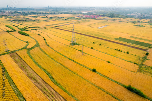 plain, aerial, overhead, agriculture, wheat, wheatfield, grain, crop, planting, ripe, harvest, growing, bright, gold, countryside, rural, labor, field, summer, nature, farm, farmland, land, staple, serenity, healing, joy, security, huge, geography, earth, harvester, machine, machinery, operation, crop, farming