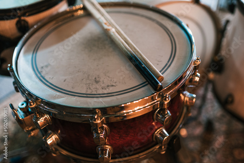 High angle of wooden drumsticks on drum prepared for live performance of rock band in studio