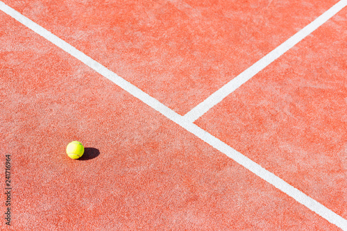 background, ball, color image, competitive sport, court, day, full frame, horizontal, no people, outdoors, photo, red, shadow, single line, sphere, sport, still life, summer, sunlight, sunny, tennis, tennis ball, white color