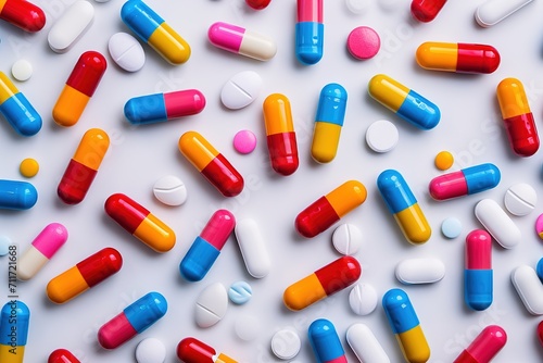 High angle view of various colored pill capsules on a white background. Medicine, medical, medical concept.