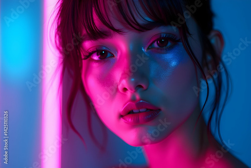 High Contrast Portrait of a Woman with Glitch Makeup, A Study in Neon Illumination and Digital Aesthetics showcasing a fusion of beauty and technology
