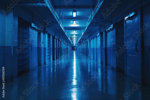 High Definition Picture of Nighttime Image of a BlueHued Prison Corridor