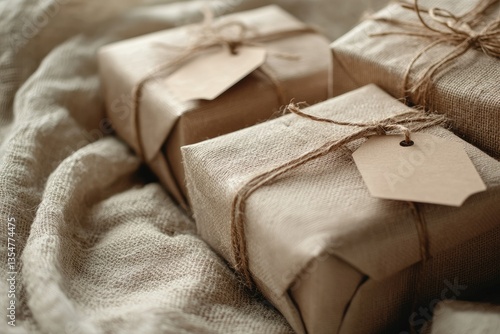 High Definition Visual of Beautifully Wrapped Gift Boxes with Tags on Textured Fabric
