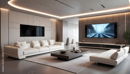 High end modern living room with white leather couch and a large flat screen tv mounted on the wall, brutalist architecture mixed with modern futuristic minimal design