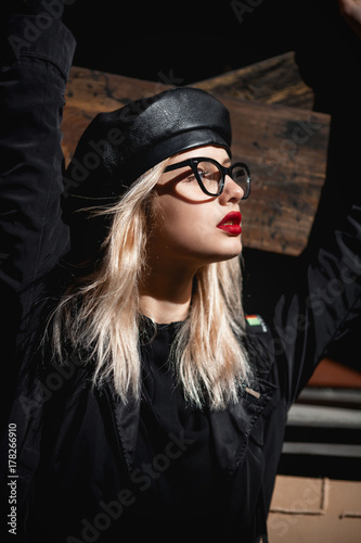 High fashion close up portrait of sexy blong woman in leather cap and provocative red lips over wooden background.