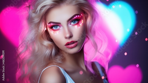 High Fashion model girl in colorful bright sparkles and neon lights posing in studio, portrait of beautiful sexy woman, trendy glowing make-up. Art design colorful make up. Glitter Vivid neon makeup