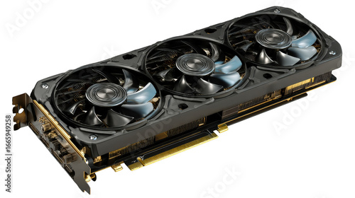 High performance graphics card with three fans and gold accents against black background, cut out transparent