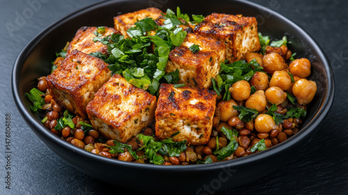 High protein vegan meal with lentils, tofu, and chickpeas, garnished with fresh herbs