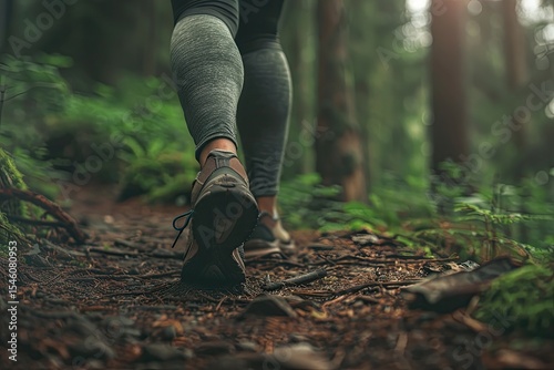 High Resolution of Back View of Young Woman Walking on a Trail in the Forest