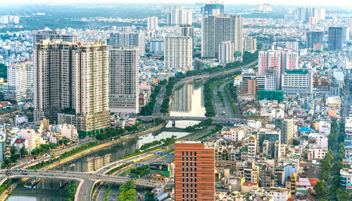 High view Saigon central skyline when afternoon down urban areas with tall buildings along river showing development country in Ho Chi Minh City, Vietnam