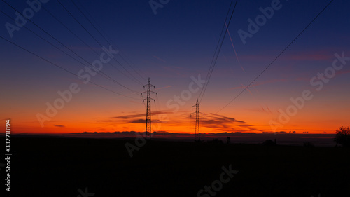 pylon, sunset, blue, cable, electric, electrical, electricity, energy, engineering, evening, high, industrial, industry, landscape, background, line, metal, night, pole, power, silhouette, sky, structure, sun, technology, tower, transmission, voltage, wire