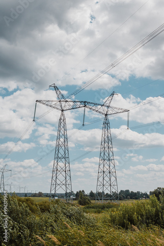 High voltage pylons against the blue sky with white clouds and bright green meadow. Power lines stretching into the distance. Perspective. Electricity