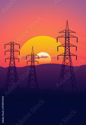 sunset, electricity, powerline, technology, energy, infrastructure, transmission, silhouette, sky, cloud, dusk, industrial, landscape, orange, yellow, digital artwork, graphic design, engineering, communication, network, connection, electricity pylon, tall, metal, steel, modern, industry, innovation