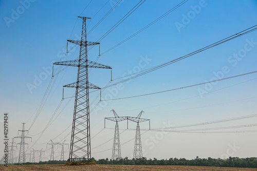 blue, sky, sunny, day, high, voltage, field, power, electricity, line, transmission, tower, background, outdoors, energy, environment, technology, system, electric, equipment, danger, electrical, steel, cable, distribution, generation, wire, station, construction, engineering, united, industrial, structure, main, watt, pole, tall, energetic, tension, pillar, current, volt, conductor, generator, megawatt, substation, pylon, modern