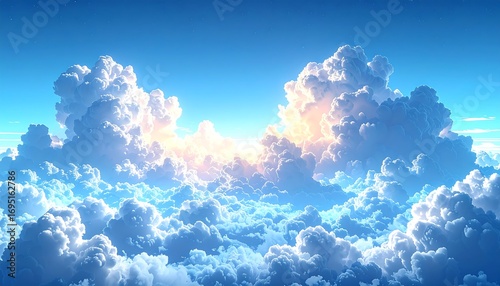 cloud, sky, blue, light, bright, sun, sunrise, cumulus, fluffy, huge, aerial, panorama, white, nature, scene, upper, atmosphere, daytime, sunshine, thick, large, soft, softness, warm, colours, lightness, texture, detail, wide, immensity