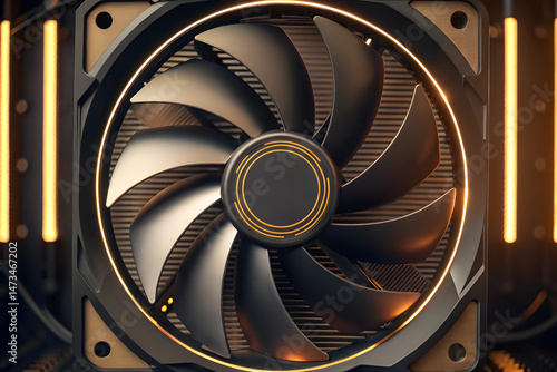 computer hardware, technology, closeup, black, gold, orange, illuminated, blade, ventilation, tech, power, speed, efficient, digital, server, futuristic, detailed, abstract, fan, cooler, air, propeller, cooling, blow, industrial, heat, cold, object, metal, cool, computer, electric, retro, card
