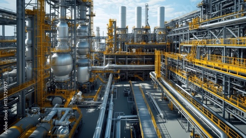 industry, refinery, petrochemical, factory, plant, manufacturing, production, industrial, technology, engineering, construction, infrastructure, energy, power, oil, gas, chemical, pipeline, tank, vessel, equipment, machinery, metal, steel, pipe, tube, fitting, platform, paseo, stair, safety, security, automation, process, complex, intricate, detail, precision, architecture, landscape, exterior, overhead, aerial, view, perspective, modern, contemporary
