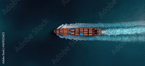 ship, cargo, container, water, ocean, vessel, transportation, logistic, maritime, shipping, freight, movement, speed, arousing, dark, blue, brown, container, aerial, top, view, transport, commerce, globalisation, international, industry, economy, trade, delivery, modern, powerful, efficient, technology, business, global, oceanic