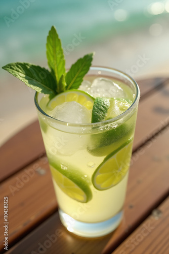 highball glass with mojito cocktail with ice and lime slices on a wooden table near a sandy beach.