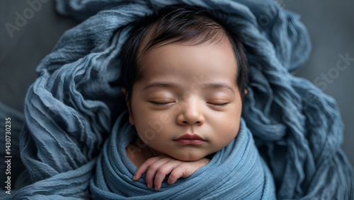 High-Detail Close-Up Portrait of a Sleeping Newborn with Dark Skin, Wrapped in Blue on a Textured Background