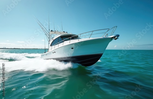 High-end sport fishing boat speeds across turquoise water. Luxury yacht, motor vessel at speed in the ocean. Miami, Florida, cruising under blue sky, marine background, nautical recreation.