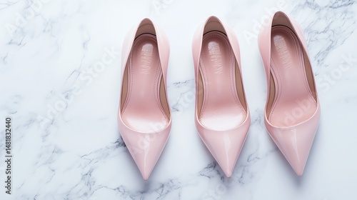 High-heels in a soft, light pink color are displayed on a polished marble surface.