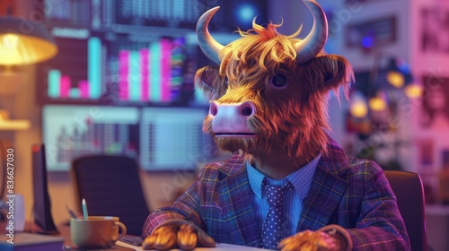 highland, cow, cartoon, business, suit, businessman, financial, chart, screen, modern, office, professional, work, technology, animal, corporate, datum, trendy, illustration, digital, market, finance, trader, stylish, workplace, stock, sophisticated